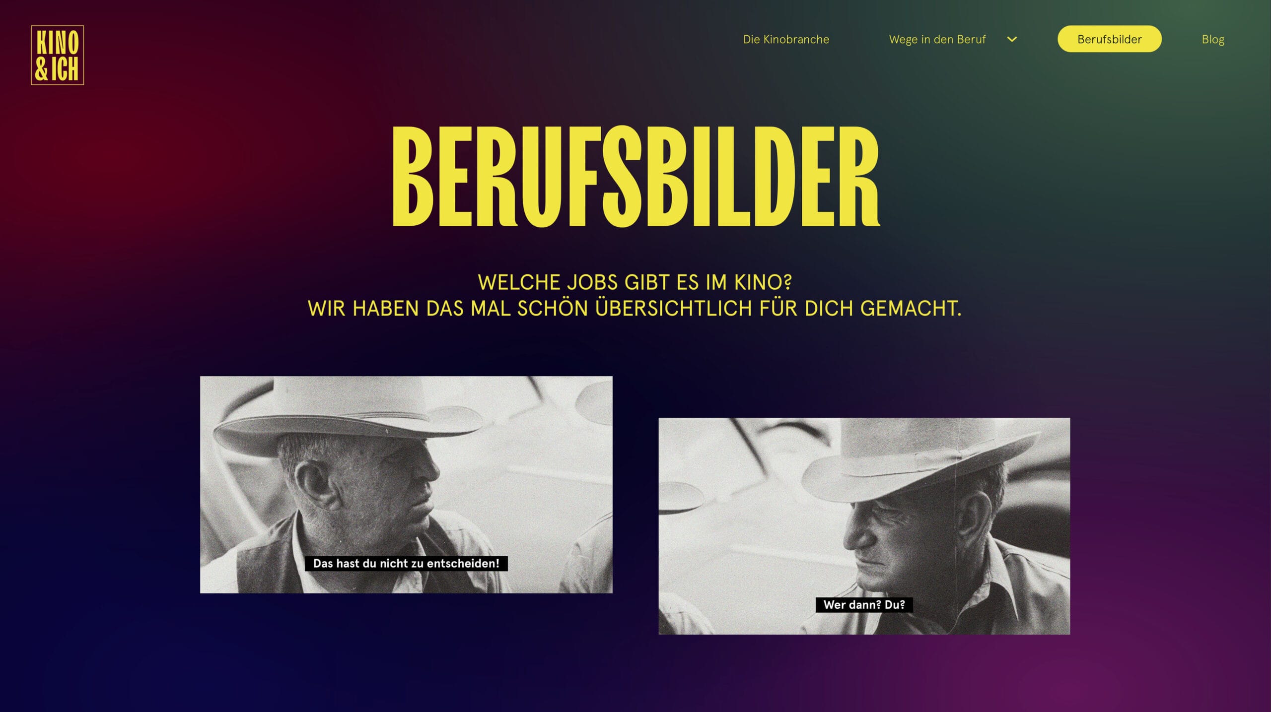 KINO & ICH geht deutschlandweit einen lange überfälligen Schritt nach vorn: Das Kino als Arbeitgeber wird mit all seinen Vorzügen zum ersten Mal überhaupt kraftvoll präsentiert. Berufsbilder werden verdeutlicht und erlebbar gemacht.