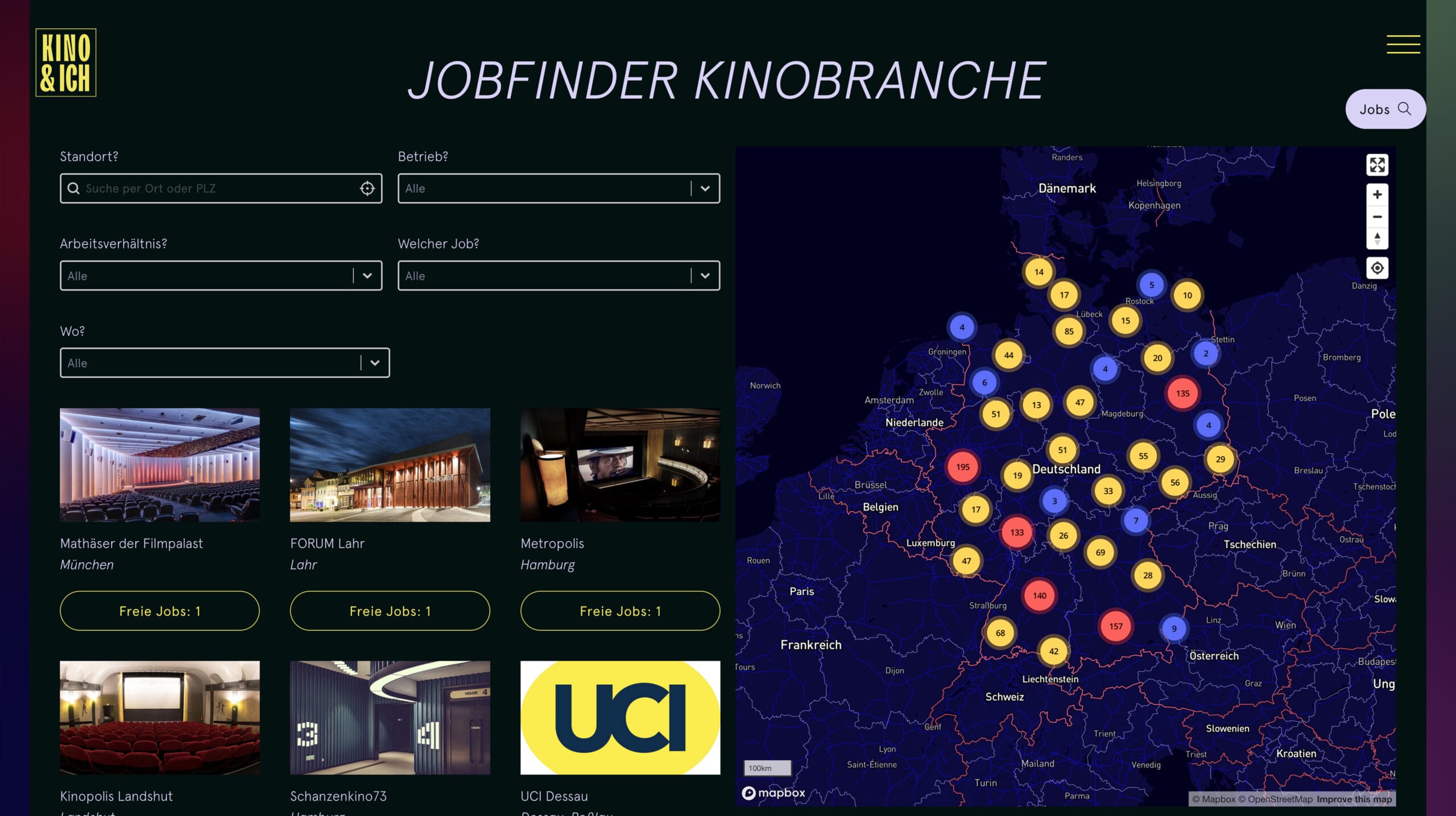 Durch ein userfreundliches Backend fällt es den Kinobetreibern leicht, sich dort zu präsentieren und offene Stellen zu bewerben. Derzeit sind über 2.000 Kinos und weitere Betriebe aus der Branche vertreten.