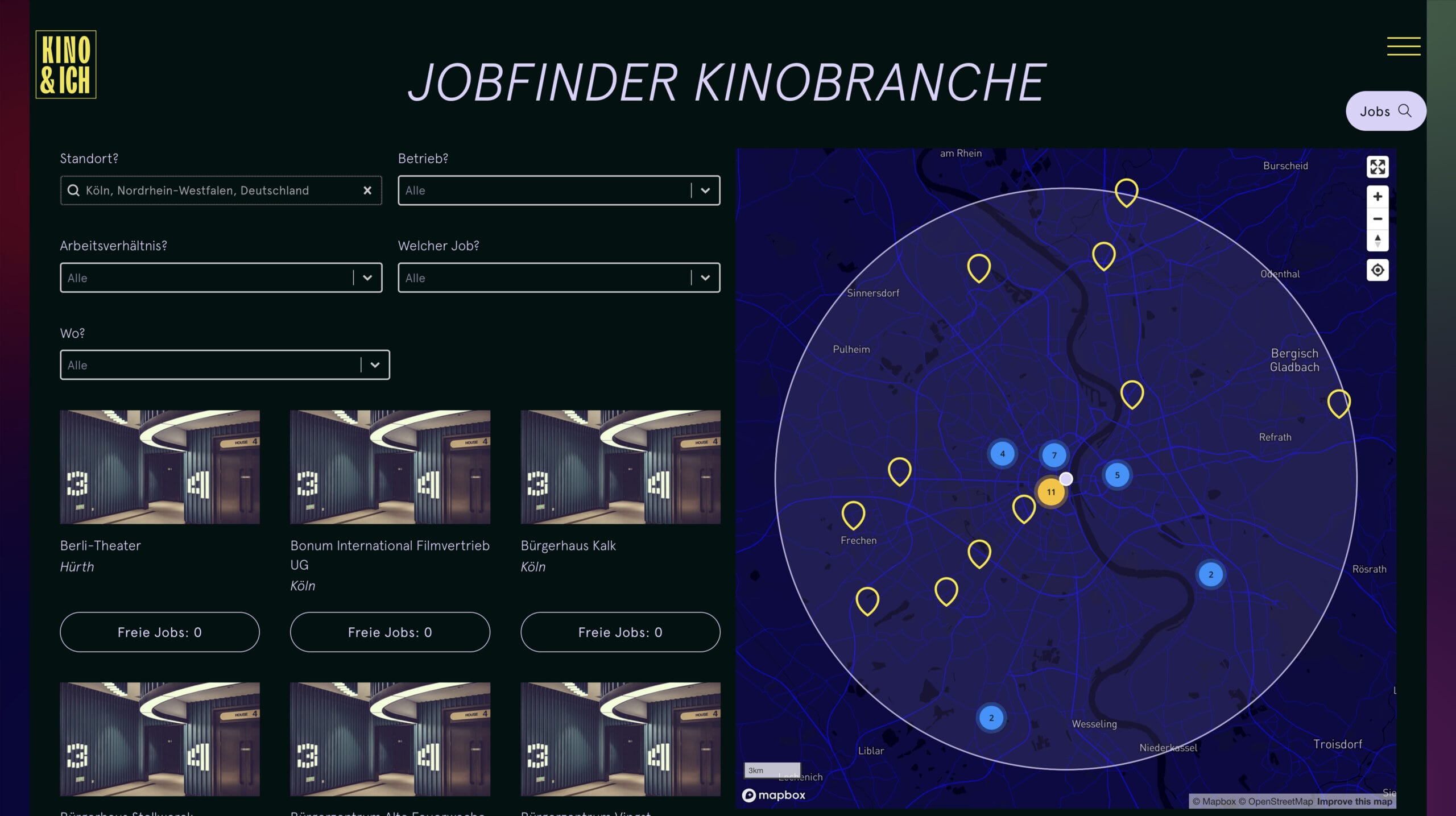 Mit dem Kinojob-Finder können sich Interessierte die gesamte Landschaft der deutschen Filmtheater zeigen lassen. Selbstverständlich auch gefiltert nach Unterkategorien.